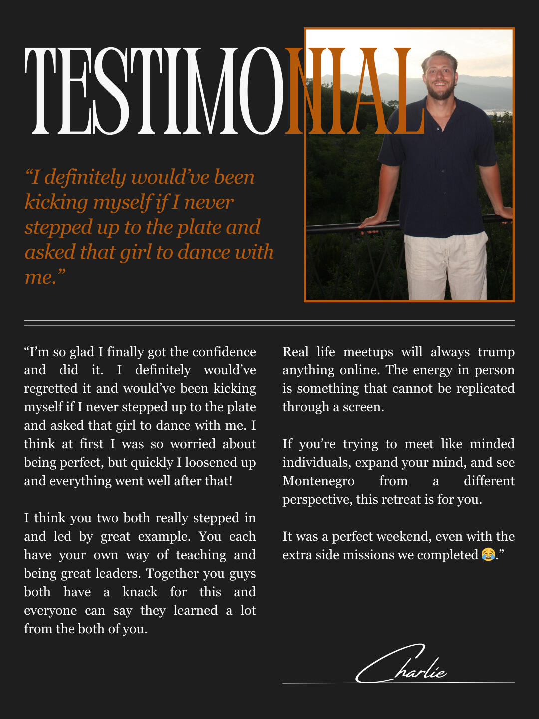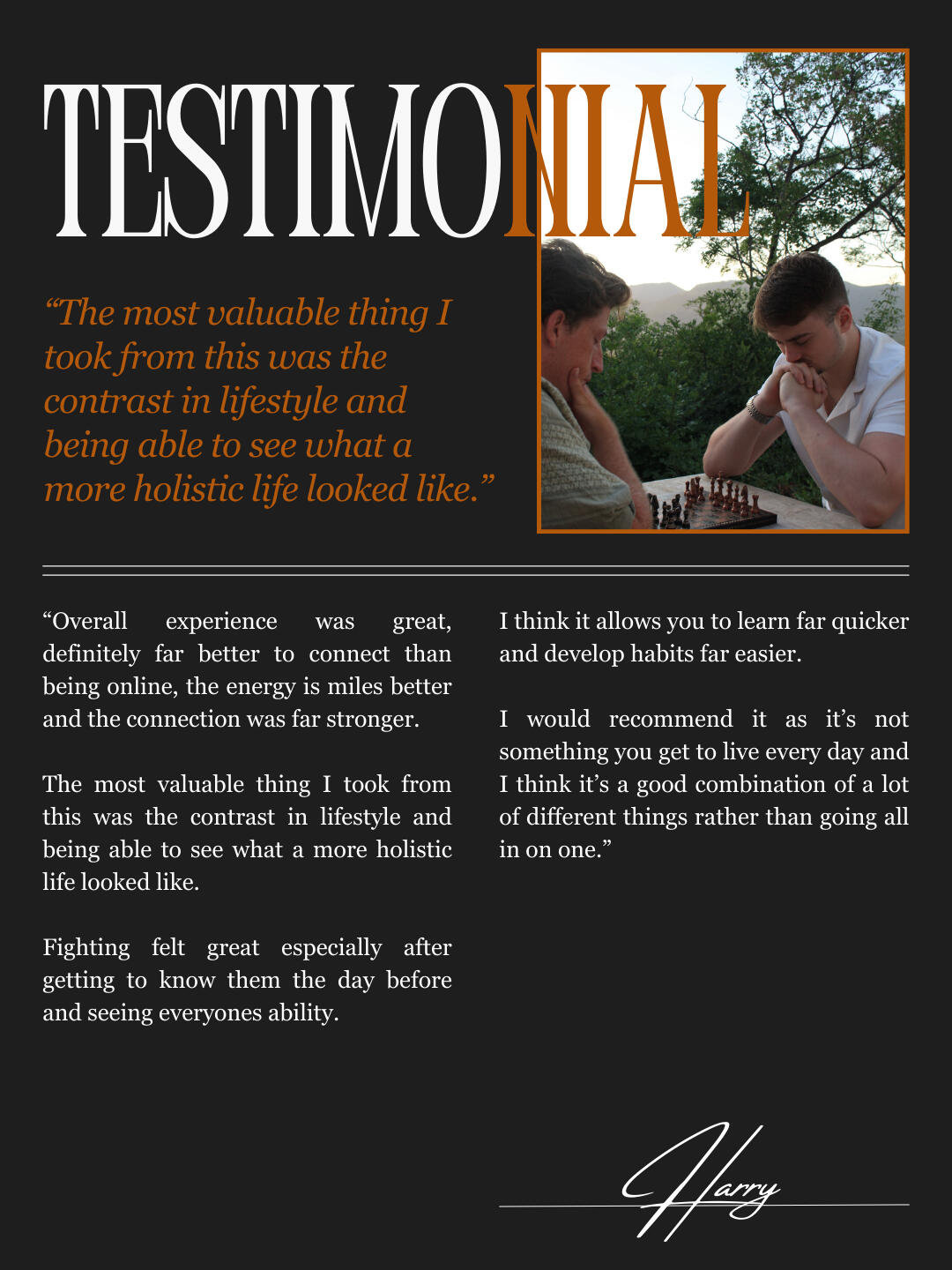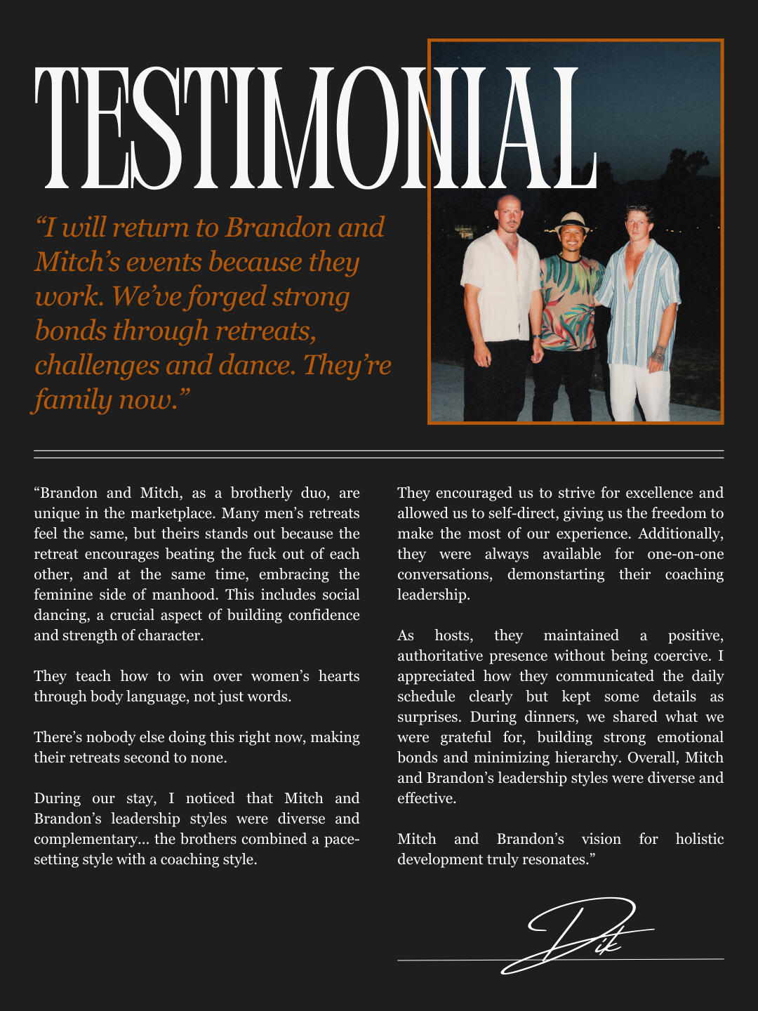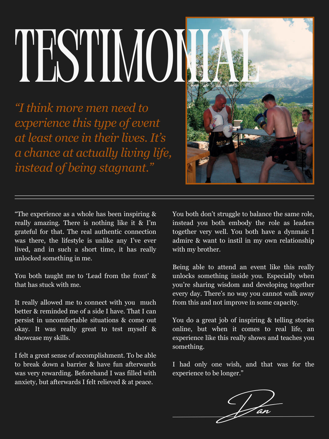 1-on-1 rapid personal growth experience with the Spalding Brothers in Tivat, Montenegro.We host countless Men from all walks of life to stay with us and experience a completely one-of-a-kind lifestyle that we have consciously curated for our health and personal growth.Men immerse themselves in our Way of life, a Way that has given us unshakeable confidence and immense self belief, knowing exactly who we are and where we are going in life.Our mission is to instil this same confidence in the next generation of Men, so they can lead meaningful and fulfilling lives that they love and continue to get stronger, healthier, more attractive, more confident, and more successful with each passing year.If you, your son, or any young Man you know is lacking direction, clarity, and purpose in his life, send him to us and he will leave a transformed Man.To find out more about the other half of the Spalding Brothers, you can visit Brandons website here.